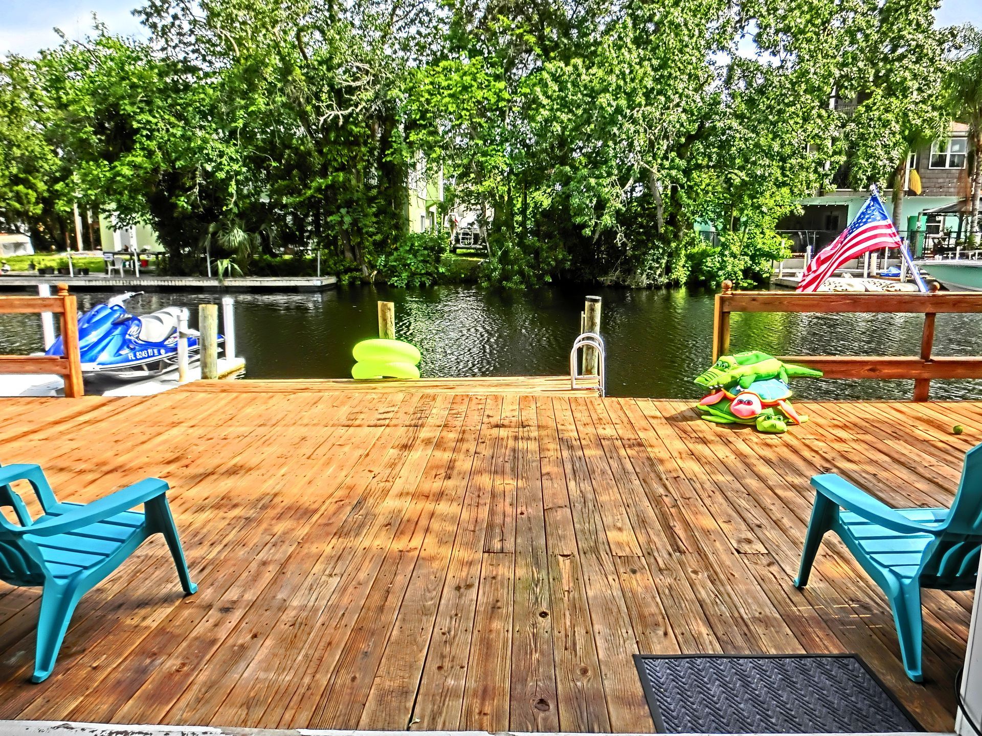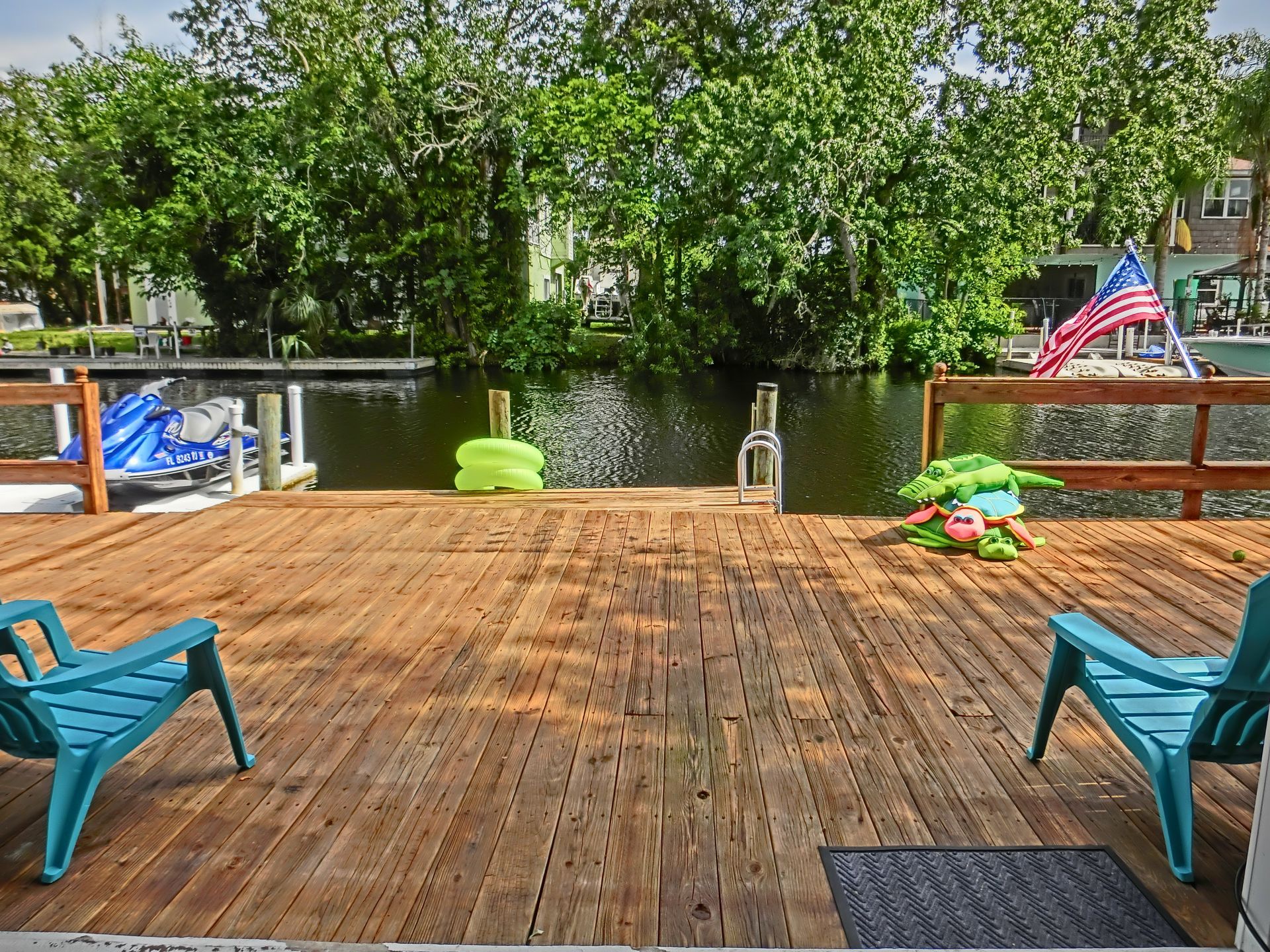 This home is equipped for excitement with 4 single adult, 2 youth and 1 triple kayak. You may also choose to try out Big Red- who we believe is the best beginners stand up paddle board. You will also find a large floating mat to enjoy lounging around on right off the dock. Sorry Jet Ski pictured is not included. However, there is dock space to tie up your own boat or ski if you choose.